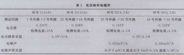 在電機驅(qū)動電滑環(huán)的過程中,為了防止電滑環(huán)的環(huán)體引線在測試時出現(xiàn)纏繞的情況,將環(huán)體引線串聯(lián)在一起,電刷引線也串聯(lián)一起,并引出加電線和測試線。在電滑環(huán)的電噪聲和電壓降測試過程中,電源通過加電線,對電滑環(huán)的1-24環(huán)路,25-50環(huán)路提供電源,檢測儀器只要對測試線進行檢測,就可以測試每一個回來的電壓降和電噪聲。